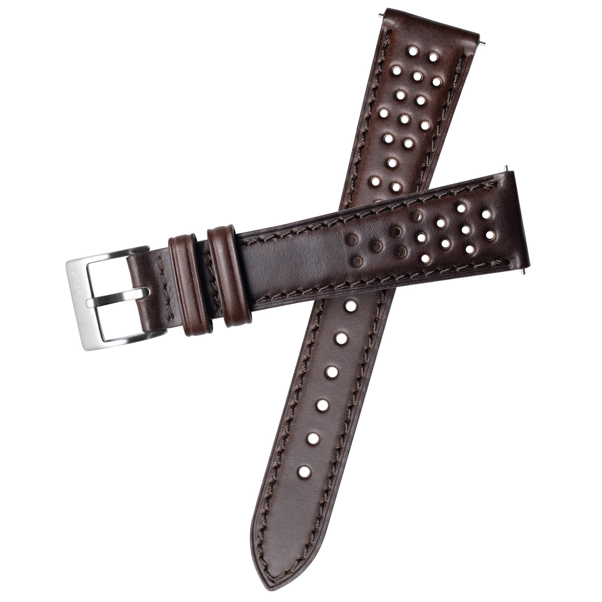 Custom 20mm Italian leather racing strap, featuring a quick release system that allows for tool-free strap changes.