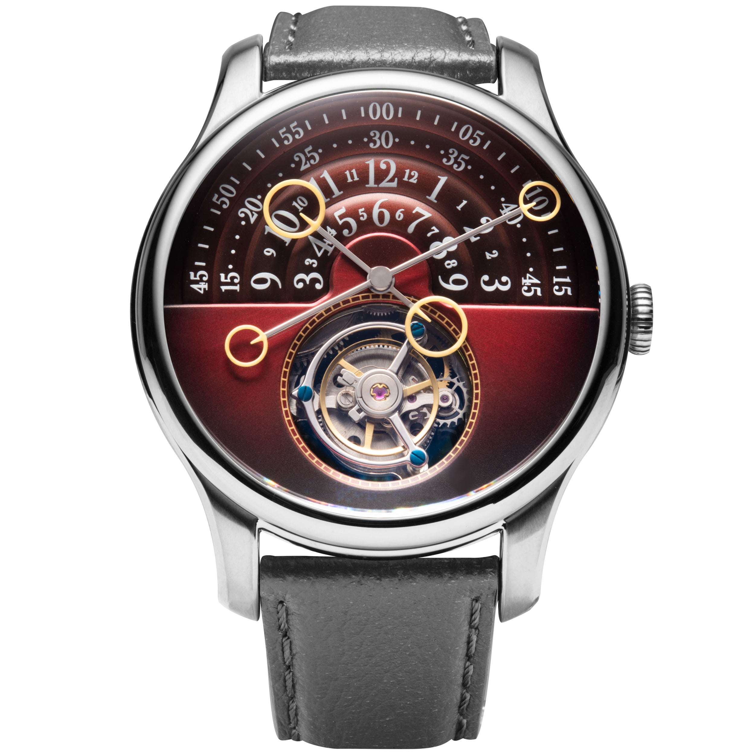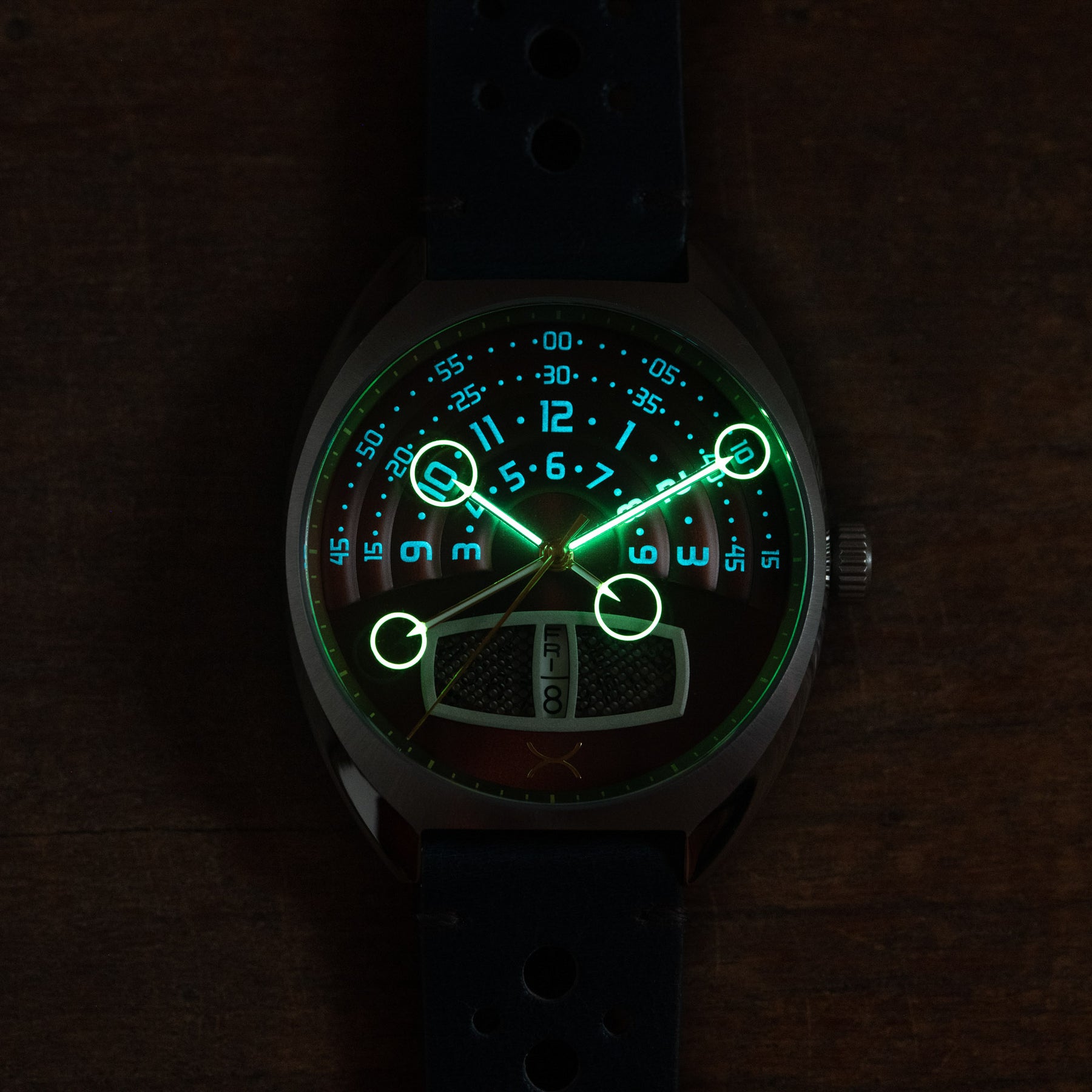 The Halograph III Automatic tells time using our signature split display, which we argue is easier to tell the time than a traditional clock. Simply read the time inside each circle at the top of the watch. The inner circle shows the hour, and the outer circle shows the minutes. And when the lights go out, the Swiss SuperLumiNova transforms the time-telling into that of a clock with a traditional hour and minute hand.
