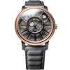 Using our signature method of time telling with orbiting moons as watch hands, the hours and minutes float above a slice of actual meteorite. The grille was inspired by a spacecraft window giving the sense of looking out at the stars. Swiss Super-LumiNova is printed on the inner and outer edge for improved legibility in both light (and especially) dark conditions.