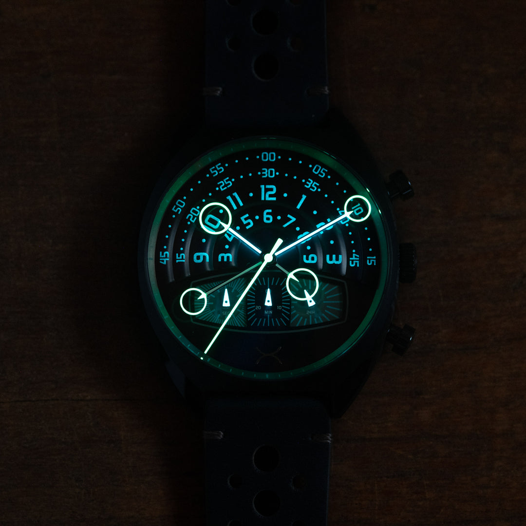 The limited-edition Xeric Halograph III Chrono channels the boundary-pushing spirit of the 1960s, blending vintage watchmaking with bold automotive design. Its upgraded case, striking colors, and retro-inspired linear chronograph—reminiscent of classic dash gauges—are powered by a precise Miyota movement. Xeric’s signature split display makes time easy to read at a glance, while Swiss SuperLumiNova transforms the dial into a traditional-style display in low light.