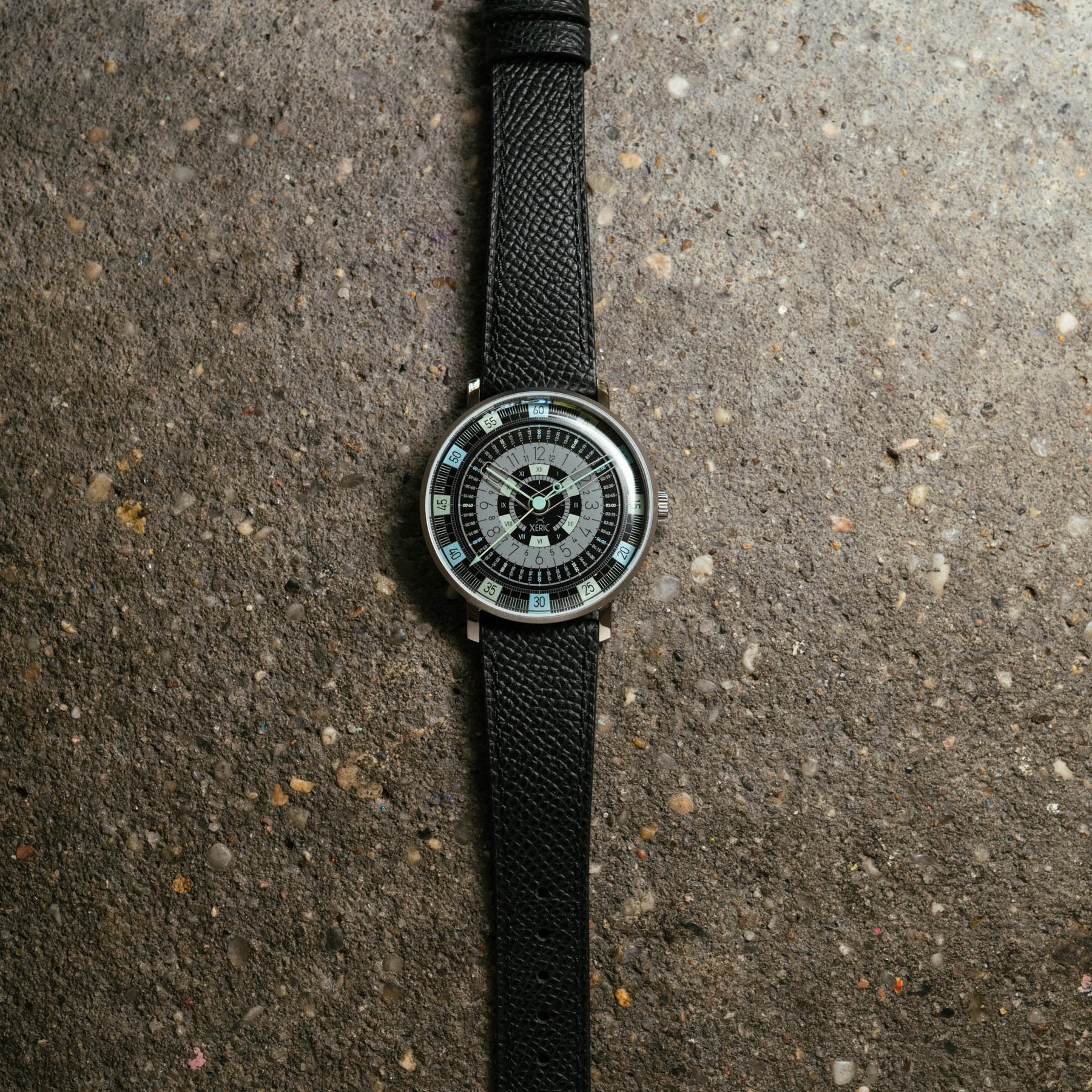 Discover the Xeric Omnigraph Automatic—a modern tribute to the circular slide rule, once an essential tool for solving complex calculations. This limited-edition timepiece transforms mathematical precision into bold design, featuring radial time display, Roman numerals, digital-style indicators, and laser-cut sapphire glass hands that glide above the dial with striking clarity. Powered by the high-beat Miyota 9039 automatic movement, the Omnigraph delivers exceptional accuracy and reliability.
