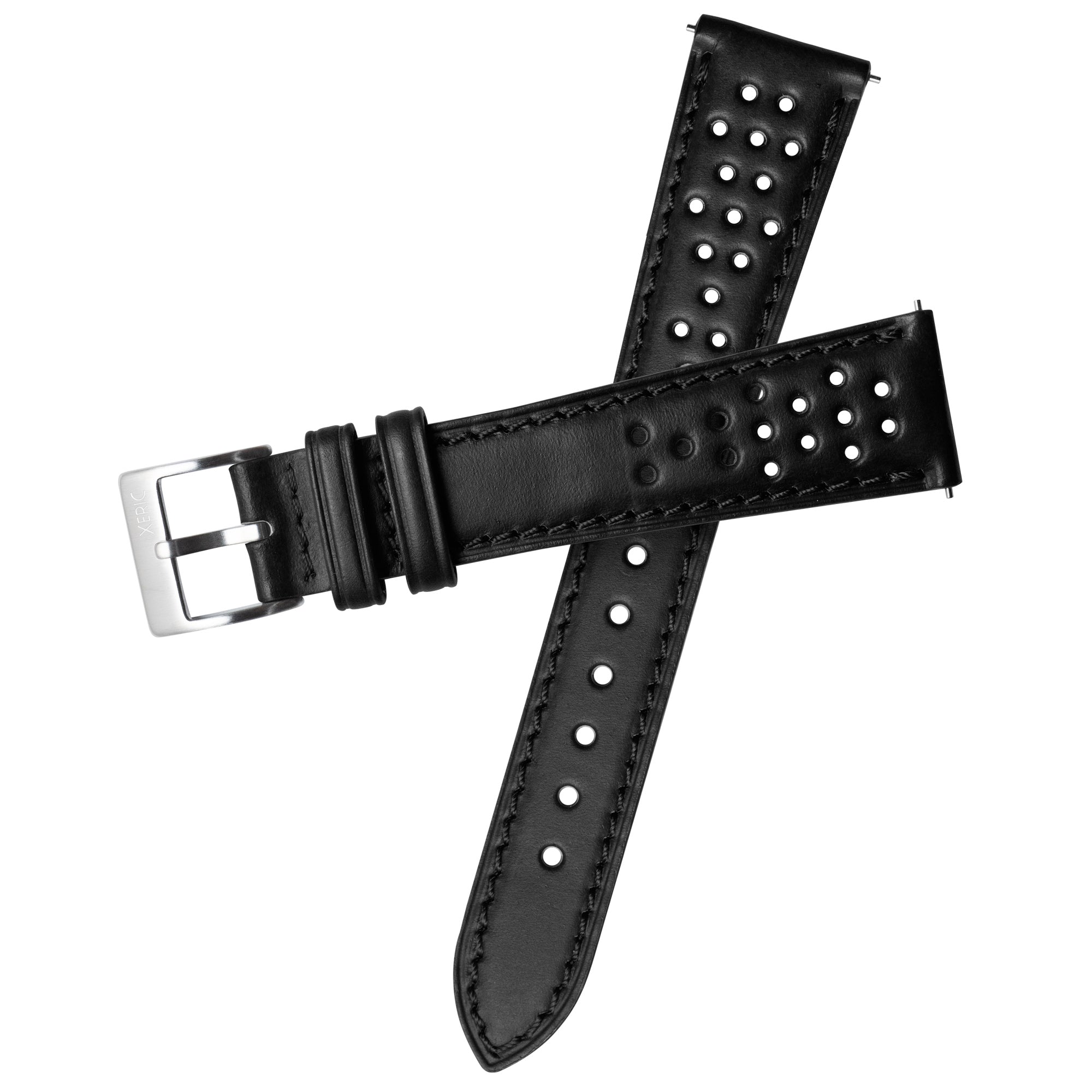 Custom 20mm U.S. Horween leather racing strap, featuring a quick release system that allows for tool-free strap changes.