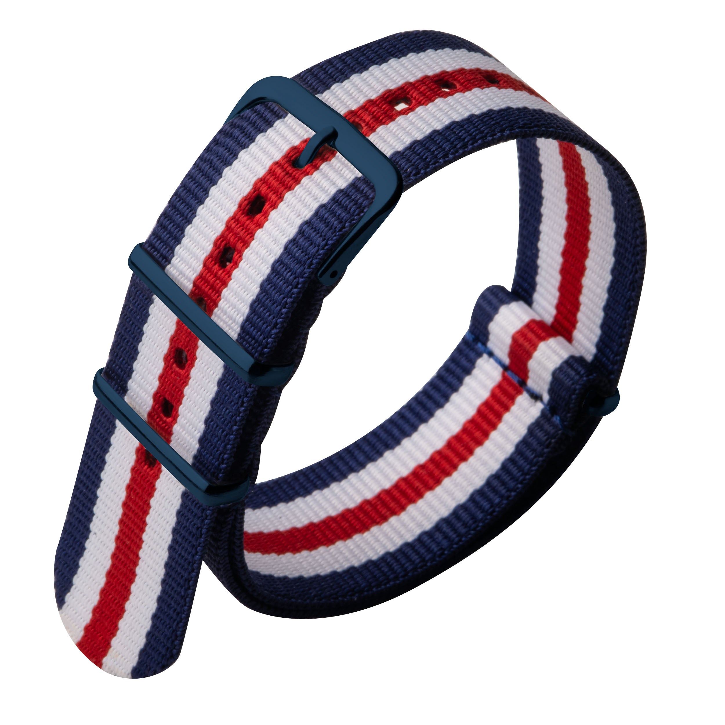 A polyester strap with stainless steel buckle and fitted keepers. Available in a variety of bold colors and materials, these natostyle straps convey the rugged yet contemporary and stylish look.