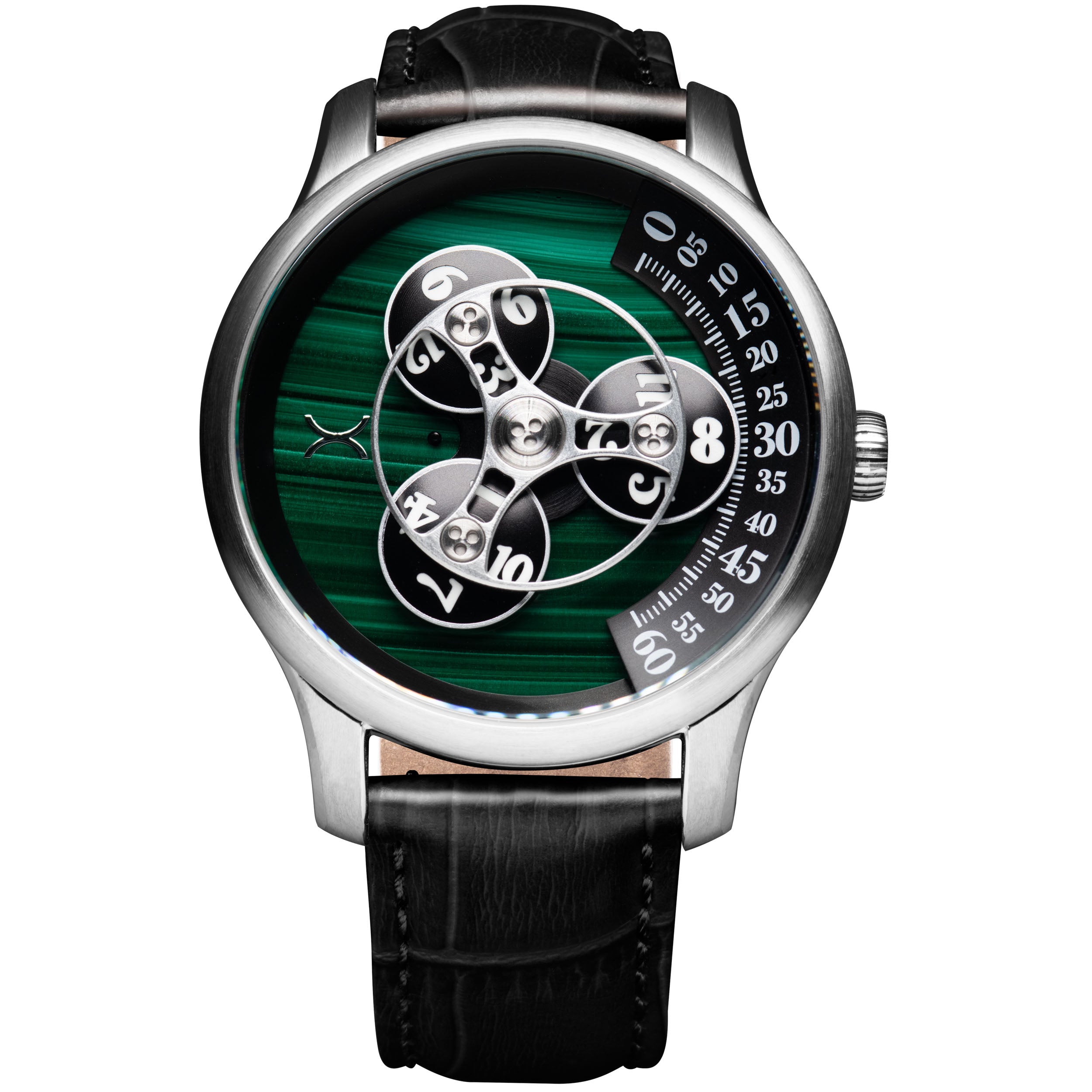 We used the best materials to create the Triptych Automatic – a beautifully brushed case made of 316L stainless steel, colorful anodized aluminum module arms, padded croc-stamped Italian leather with full stitching, and Swiss-made Super-LumiNova minutes and hours.
