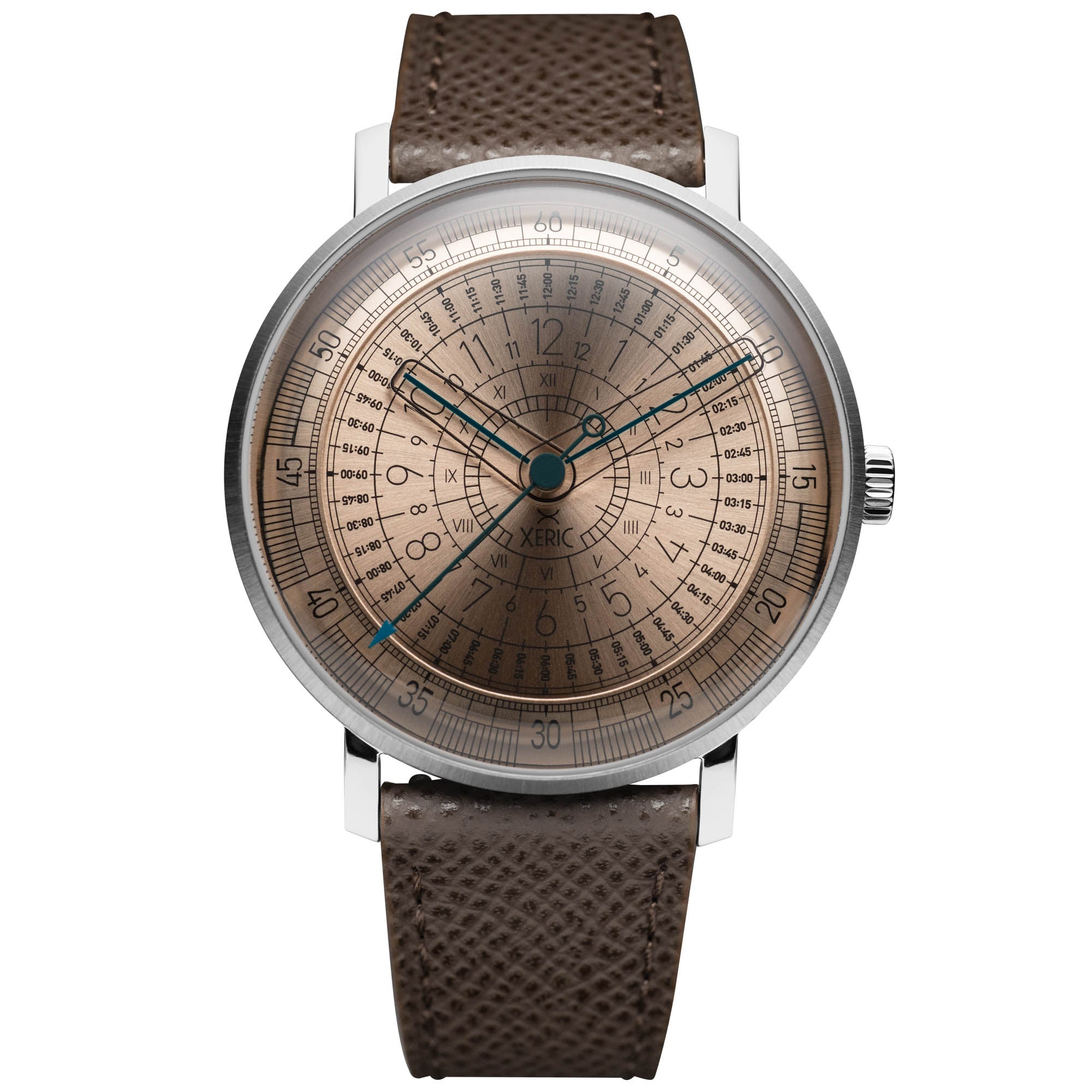 Discover the Xeric Omnigraph Automatic—a modern tribute to the circular slide rule, once an essential tool for solving complex calculations. This limited-edition timepiece transforms mathematical precision into bold design, featuring radial time display, Roman numerals, digital-style indicators, and laser-cut sapphire glass hands that glide above the dial with striking clarity. Powered by the high-beat Miyota 9039 automatic movement, the Omnigraph delivers exceptional accuracy and reliability.