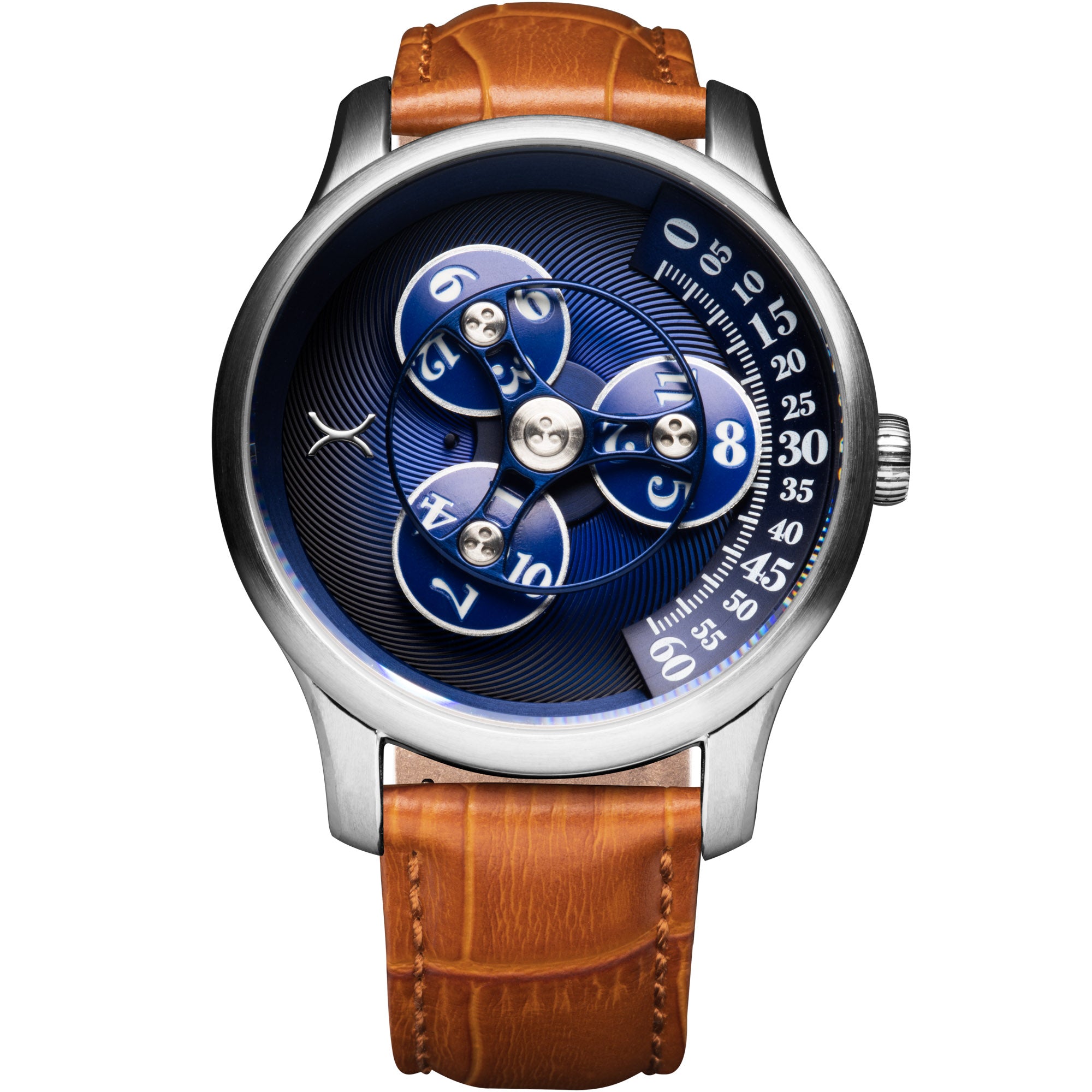 Reading the time looks complicated but is actually quite easy. Simply look at where the hour meets the minutes. That’s it. As time passes, the next hour comes into view, and the geneva gear mechanism shifts the discs to their next position. A spiral guilloche-style dial creates a sense of static motion that isn’t typically seen in a watch dial, almost giving the appearance that the wandering hour mechanism is engraving the texture down into the dial.