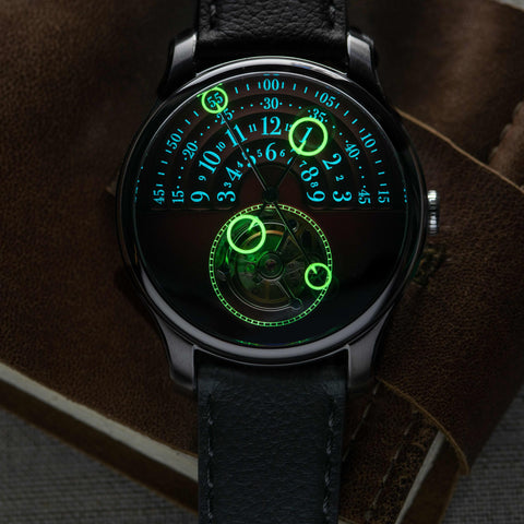 The Halograph Tourbillon is the ultimate Xeric watch. The dial features our innovative signature split display and halo hands which float over the arcs to encircle the time. The inner arcs display the hours and the outer arcs display the minutes. The time can easily be read through the two halo hands. As the halo reaches the end of its track, a new halo appears on the opposite side. At the 6 o'clock position you see the balance wheel oscillating back and forth inside the tourbillon cage, which acts as our seconds indicator as it makes one full rotation every 60 seconds.